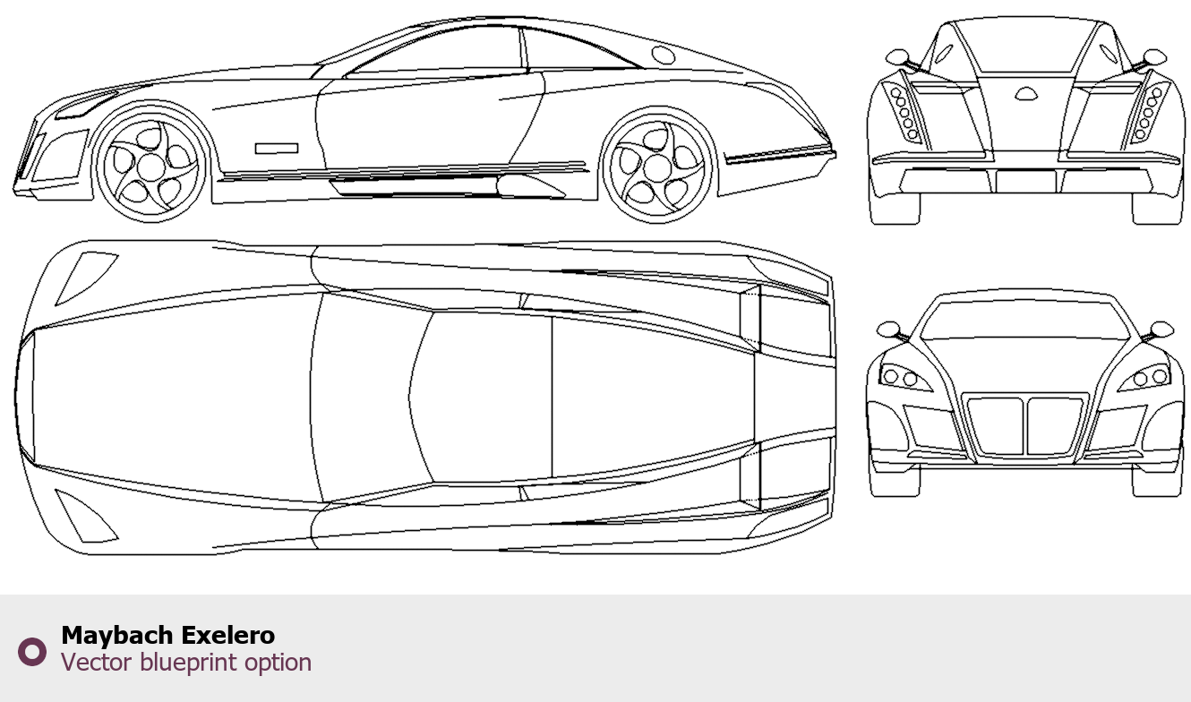 Raster blueprint of the Maybach Exelero Limousine. This free downloadable image can be used for graphic projects, digital design, and 3D modeling. The file provides accurate exterior proportions of the vehicle. Body type: Limousine.