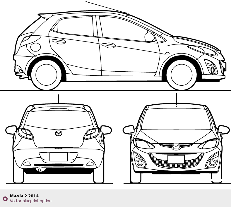 Raster blueprint of the 2014 Mazda 2 Tag. This free downloadable image can be used for graphic projects, digital design, and 3D modeling. The file provides accurate exterior proportions of the vehicle. Model year: 2014. Body type: Tag.
