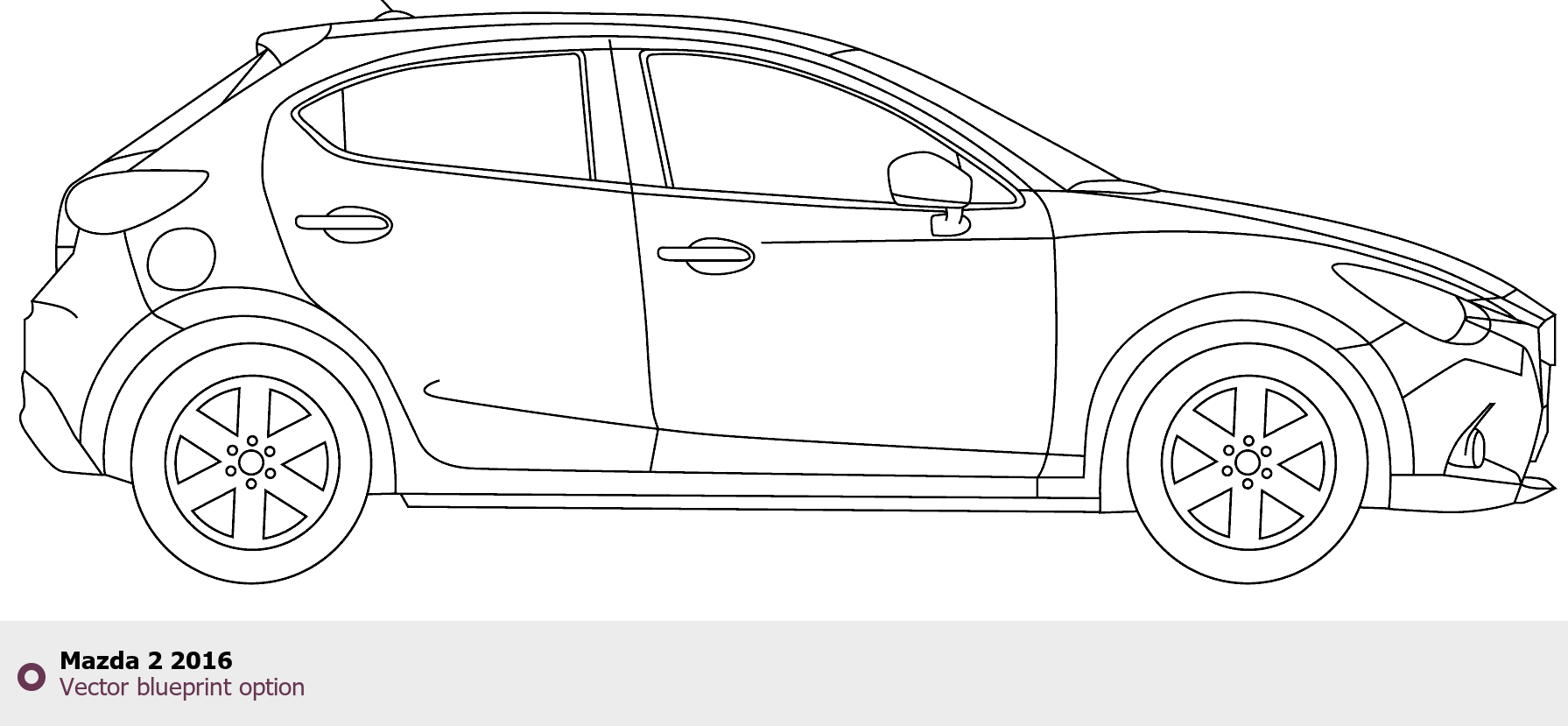Raster blueprint of the 2016 Mazda 2 Tag. This free downloadable image can be used for graphic projects, digital design, and 3D modeling. The file provides accurate exterior proportions of the vehicle. Model year: 2016. Body type: Tag.