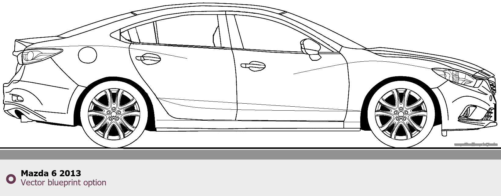 Raster blueprint of the 2013 Mazda 6 Tag. This free downloadable image can be used for graphic projects, digital design, and 3D modeling. The file provides accurate exterior proportions of the vehicle. Model year: 2013. Body type: Tag.