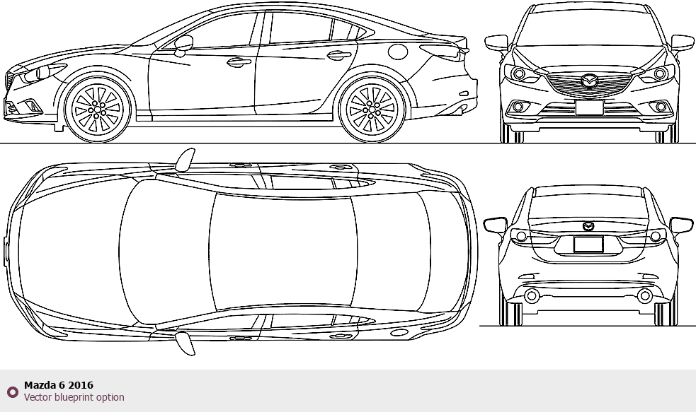 Raster blueprint of the 2016 Mazda 6 Tag. This free downloadable image can be used for graphic projects, digital design, and 3D modeling. The file provides accurate exterior proportions of the vehicle. Model year: 2016. Body type: Tag.