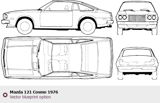 Raster blueprint of the 1976 Mazda 121 Cosmo Tag. This free downloadable image can be used for graphic projects, digital design, and 3D modeling. The file provides accurate exterior proportions of the vehicle. Model year: 1976. Body type: Tag.