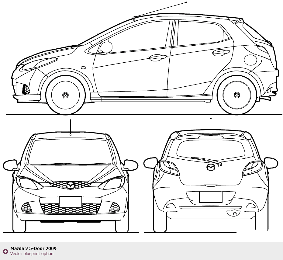 Raster blueprint of the 2009 Mazda 2 5-Door Tag. This free downloadable image can be used for graphic projects, digital design, and 3D modeling. The file provides accurate exterior proportions of the vehicle. Model year: 2009. Body type: Tag.