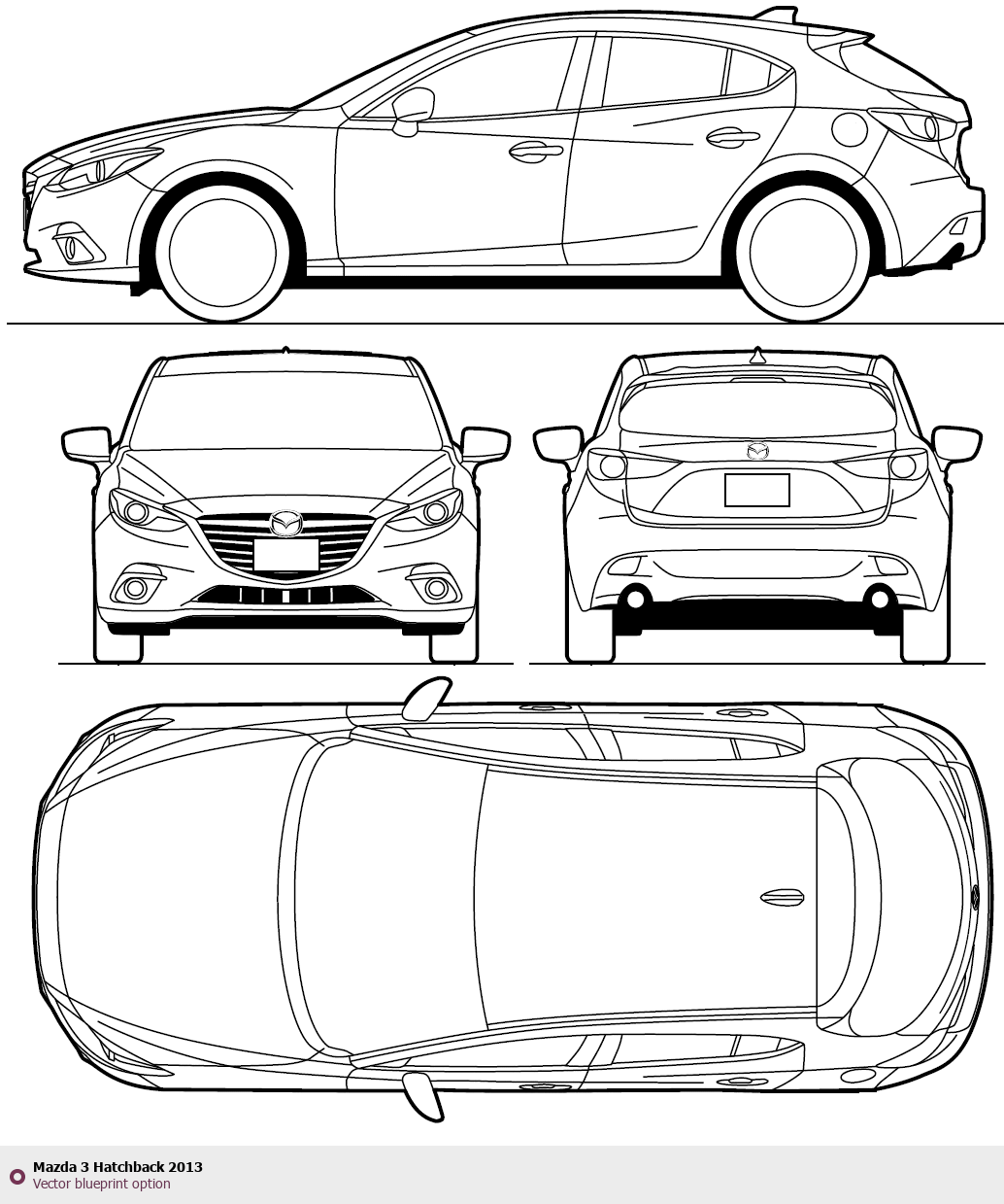Raster blueprint of the 2013 Mazda 3 Hatchback Hatchback. This free downloadable image can be used for graphic projects, digital design, and 3D modeling. The file provides accurate exterior proportions of the vehicle. Model year: 2013. Body type: Hatchback.
