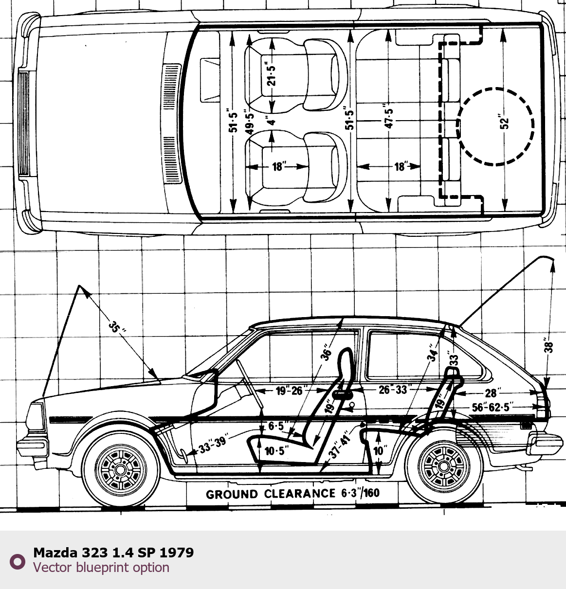 Raster blueprint of the 1979 Mazda 323 1.4 SP Tag. This free downloadable image can be used for graphic projects, digital design, and 3D modeling. The file provides accurate exterior proportions of the vehicle. Model year: 1979. Body type: Tag.