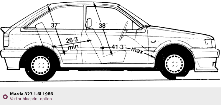 Raster blueprint of the 1986 Mazda 323 1.6i Tag. This free downloadable image can be used for graphic projects, digital design, and 3D modeling. The file provides accurate exterior proportions of the vehicle. Model year: 1986. Body type: Tag.