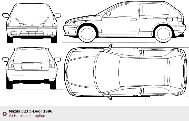 Raster blueprint of the 1996 Mazda 323 3-Door Tag. This free downloadable image can be used for graphic projects, digital design, and 3D modeling. The file provides accurate exterior proportions of the vehicle. Model year: 1996. Body type: Tag.