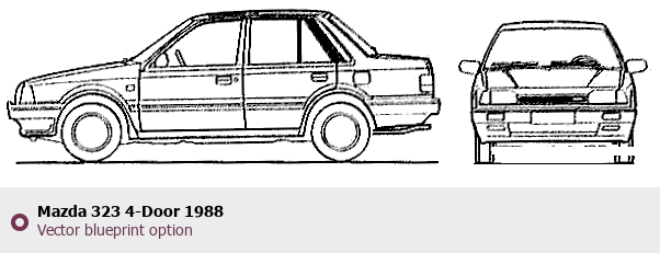 Raster blueprint of the 1988 Mazda 323 4-Door Tag. This free downloadable image can be used for graphic projects, digital design, and 3D modeling. The file provides accurate exterior proportions of the vehicle. Model year: 1988. Body type: Tag.
