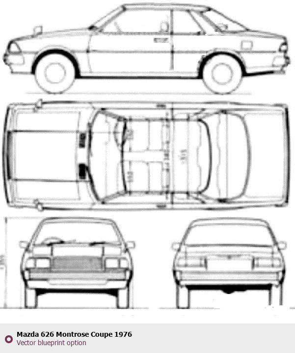 Raster blueprint of the 1976 Mazda 626 Montrose Coupe Coupe. This free downloadable image can be used for graphic projects, digital design, and 3D modeling. The file provides accurate exterior proportions of the vehicle. Model year: 1976. Body type: Coupe.