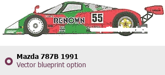 Raster blueprint of the 1991 Mazda 787B Tag. This free downloadable image can be used for graphic projects, digital design, and 3D modeling. The file provides accurate exterior proportions of the vehicle. Model year: 1991. Body type: Tag.