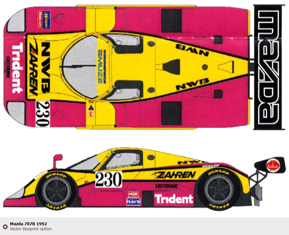 Raster blueprint of the 1992 Mazda 787B Tag. This free downloadable image can be used for graphic projects, digital design, and 3D modeling. The file provides accurate exterior proportions of the vehicle. Model year: 1992. Body type: Tag.