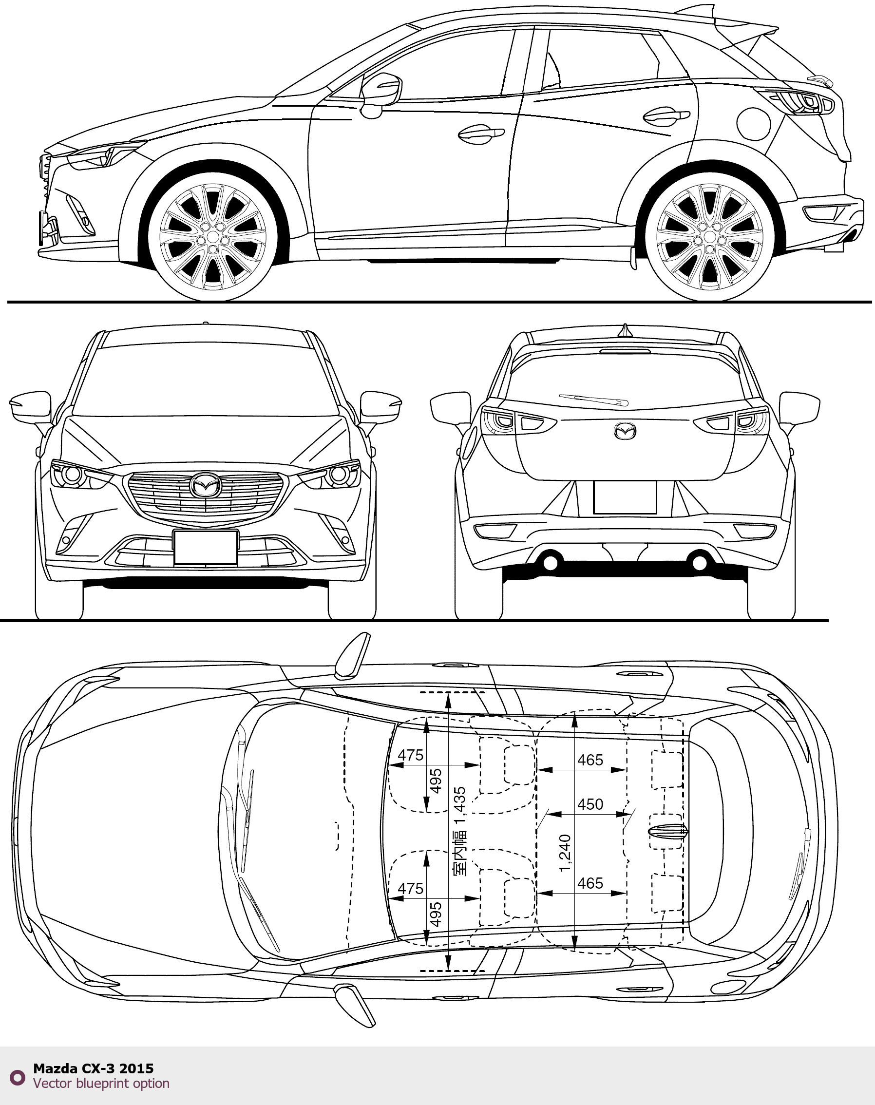 Raster blueprint of the 2015 Mazda CX-3 SUV. This free downloadable image can be used for graphic projects, digital design, and 3D modeling. The file provides accurate exterior proportions of the vehicle. Model year: 2015. Body type: SUV.