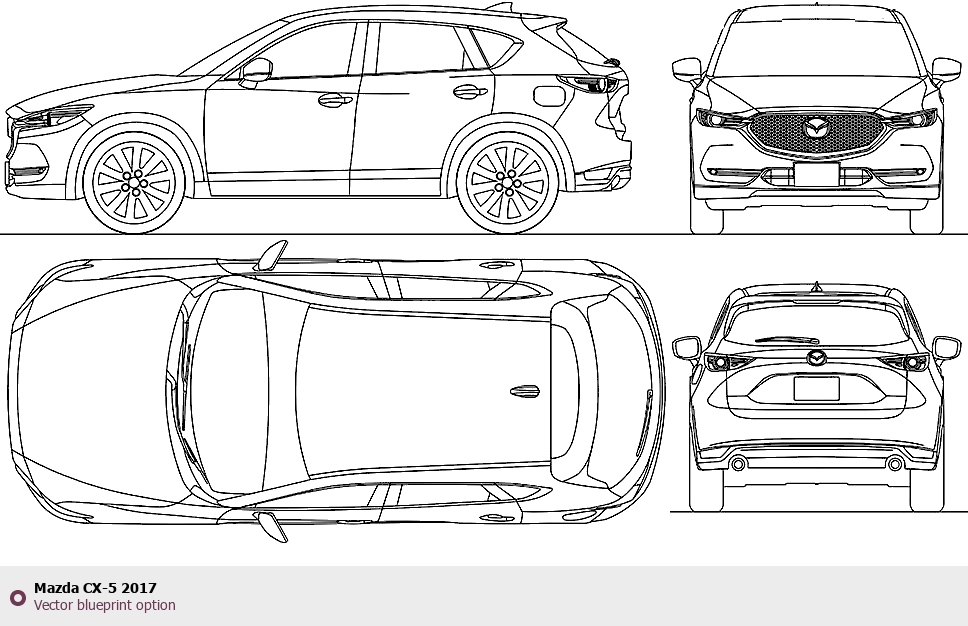 Raster blueprint of the 2017 Mazda CX-5 SUV. This free downloadable image can be used for graphic projects, digital design, and 3D modeling. The file provides accurate exterior proportions of the vehicle. Model year: 2017. Body type: SUV.
