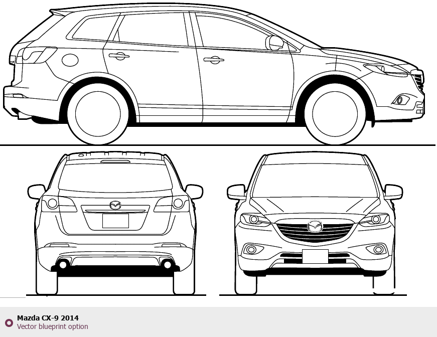 Raster blueprint of the 2014 Mazda CX-9 SUV. This free downloadable image can be used for graphic projects, digital design, and 3D modeling. The file provides accurate exterior proportions of the vehicle. Model year: 2014. Body type: SUV.