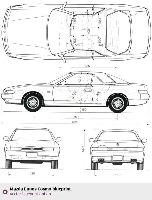 Raster blueprint of the Mazda Eunos Cosmo blueprint Coupe. This free downloadable image can be used for graphic projects, digital design, and 3D modeling. The file provides accurate exterior proportions of the vehicle. Body type: Coupe.