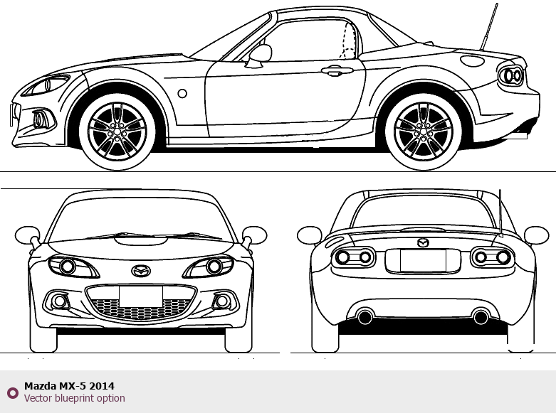 Raster blueprint of the 2014 Mazda MX-5 Roadster. This free downloadable image can be used for graphic projects, digital design, and 3D modeling. The file provides accurate exterior proportions of the vehicle. Model year: 2014. Body type: Roadster.
