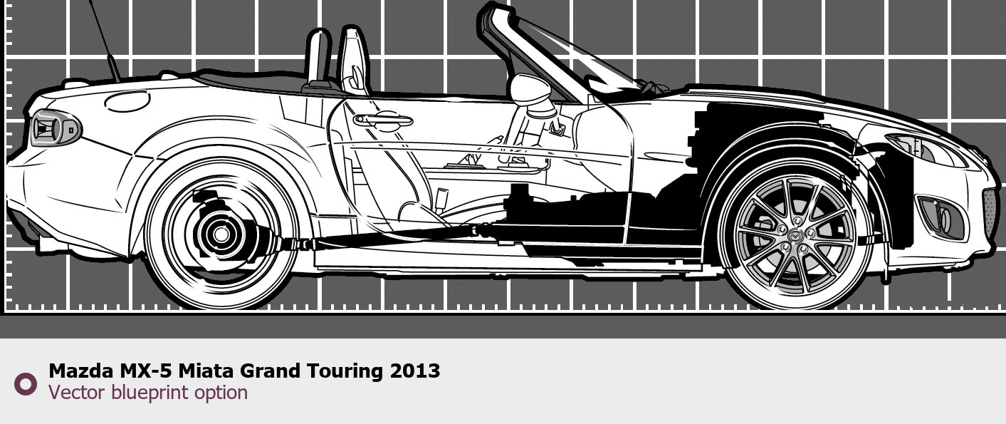 Raster blueprint of the 2013 Mazda MX-5 Miata Grand Touring Roadster. This free downloadable image can be used for graphic projects, digital design, and 3D modeling. The file provides accurate exterior proportions of the vehicle. Model year: 2013. Body type: Roadster.