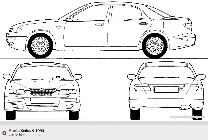 Raster blueprint of the 1993 Mazda Xedos 9 Sedan. This free downloadable image can be used for graphic projects, digital design, and 3D modeling. The file provides accurate exterior proportions of the vehicle. Model year: 1993. Body type: Sedan.