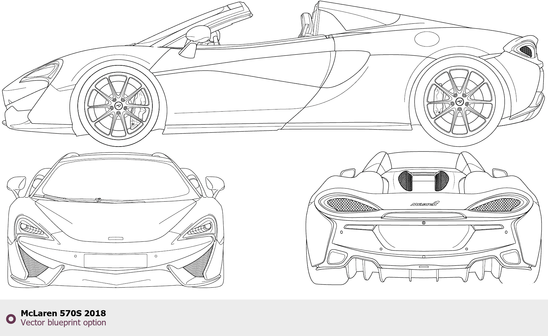 Raster blueprint of the 2018 McLaren 570S Coupe. This free downloadable image can be used for graphic projects, digital design, and 3D modeling. The file provides accurate exterior proportions of the vehicle. Model year: 2018. Body type: Coupe.