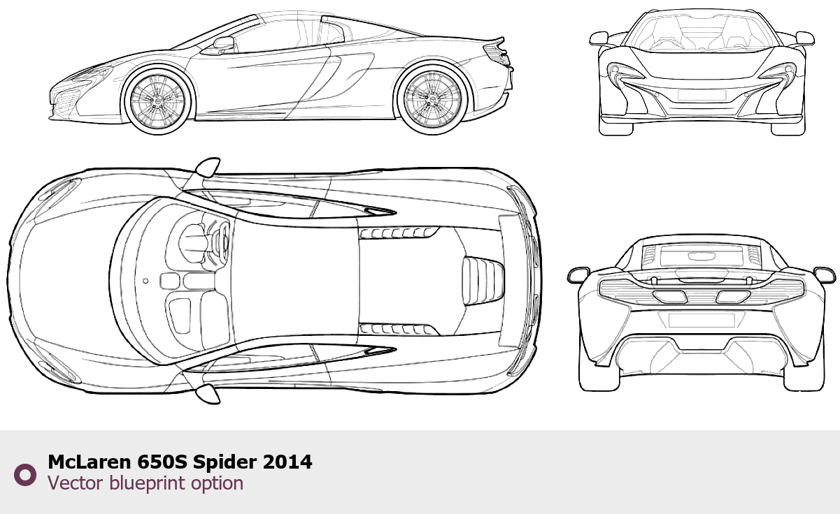 Raster blueprint of the 2014 McLaren 650S Spider Roadster. This free downloadable image can be used for graphic projects, digital design, and 3D modeling. The file provides accurate exterior proportions of the vehicle. Model year: 2014. Body type: Roadster.