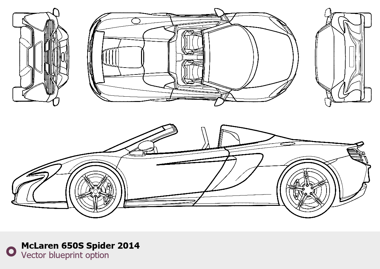 Raster blueprint of the 2014 McLaren 650S Spider Roadster. This free downloadable image can be used for graphic projects, digital design, and 3D modeling. The file provides accurate exterior proportions of the vehicle. Model year: 2014. Body type: Roadster.