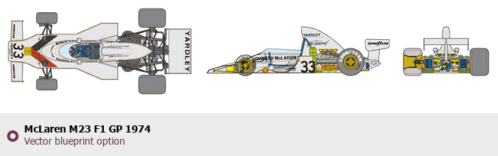 Raster blueprint of the 1974 McLaren M23 F1 GP Formula. This free downloadable image can be used for graphic projects, digital design, and 3D modeling. The file provides accurate exterior proportions of the vehicle. Model year: 1974. Body type: Formula.