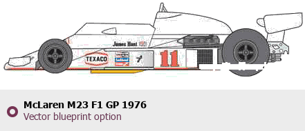 Raster blueprint of the 1976 McLaren M23 F1 GP Formula. This free downloadable image can be used for graphic projects, digital design, and 3D modeling. The file provides accurate exterior proportions of the vehicle. Model year: 1976. Body type: Formula.