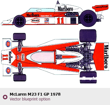 Raster blueprint of the 1978 McLaren M23 F1 GP Formula. This free downloadable image can be used for graphic projects, digital design, and 3D modeling. The file provides accurate exterior proportions of the vehicle. Model year: 1978. Body type: Formula.
