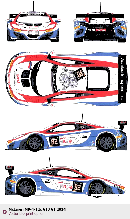 Raster blueprint of the 2014 McLaren MP-4-12c GT3 GT Coupe. This free downloadable image can be used for graphic projects, digital design, and 3D modeling. The file provides accurate exterior proportions of the vehicle. Model year: 2014. Body type: Coupe.