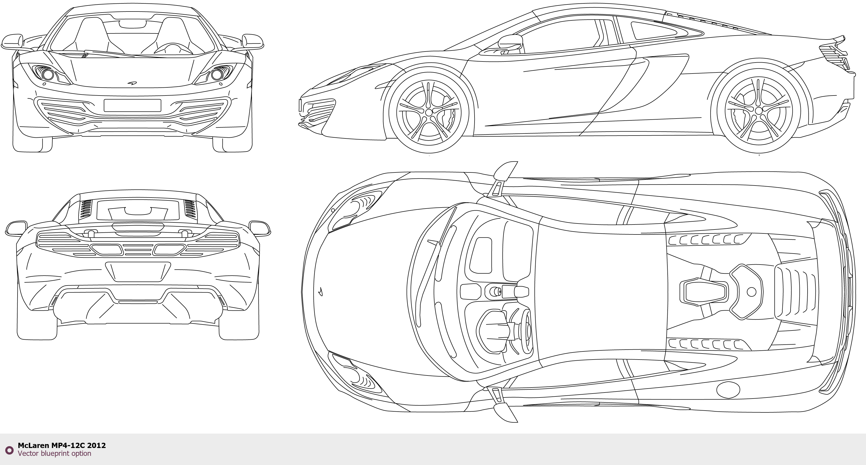Raster blueprint of the 2012 McLaren MP4-12C Coupe. This free downloadable image can be used for graphic projects, digital design, and 3D modeling. The file provides accurate exterior proportions of the vehicle. Model year: 2012. Body type: Coupe.