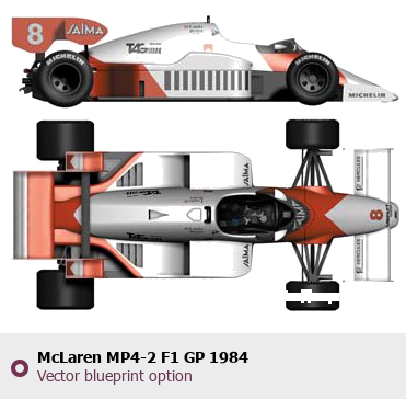 Raster blueprint of the 1984 McLaren MP4-2 F1 GP Formula. This free downloadable image can be used for graphic projects, digital design, and 3D modeling. The file provides accurate exterior proportions of the vehicle. Model year: 1984. Body type: Formula.