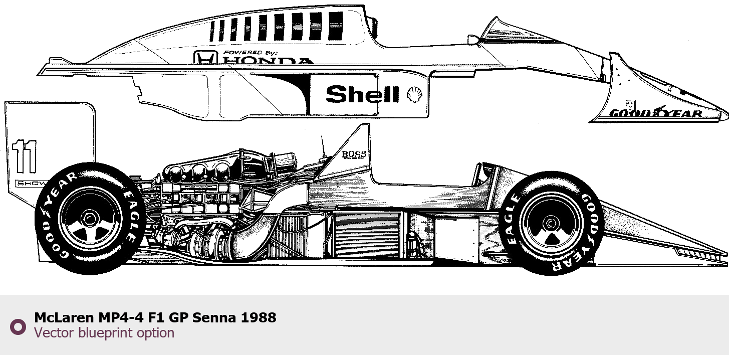 Raster blueprint of the 1988 McLaren MP4-4 F1 GP Senna Formula. This free downloadable image can be used for graphic projects, digital design, and 3D modeling. The file provides accurate exterior proportions of the vehicle. Model year: 1988. Body type: Formula.