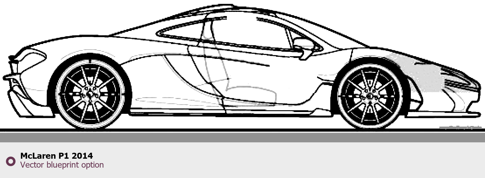 Raster blueprint of the 2014 McLaren P1 Coupe. This free downloadable image can be used for graphic projects, digital design, and 3D modeling. The file provides accurate exterior proportions of the vehicle. Model year: 2014. Body type: Coupe.