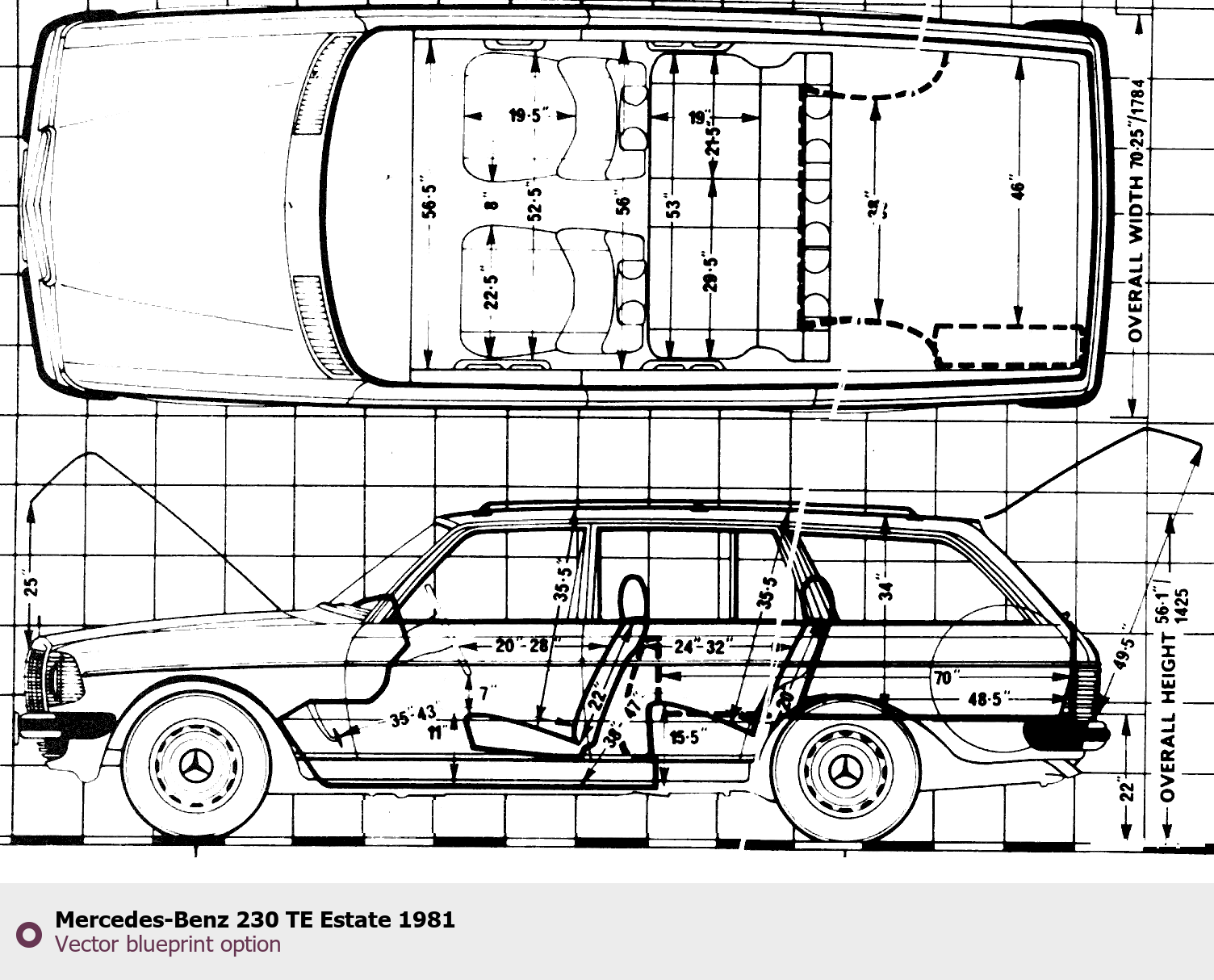 Raster blueprint of the 1981 Mercedes-Benz 230 TE Estate Wagon. This free downloadable image can be used for graphic projects, digital design, and 3D modeling. The file provides accurate exterior proportions of the vehicle. Model year: 1981. Body type: Wagon.