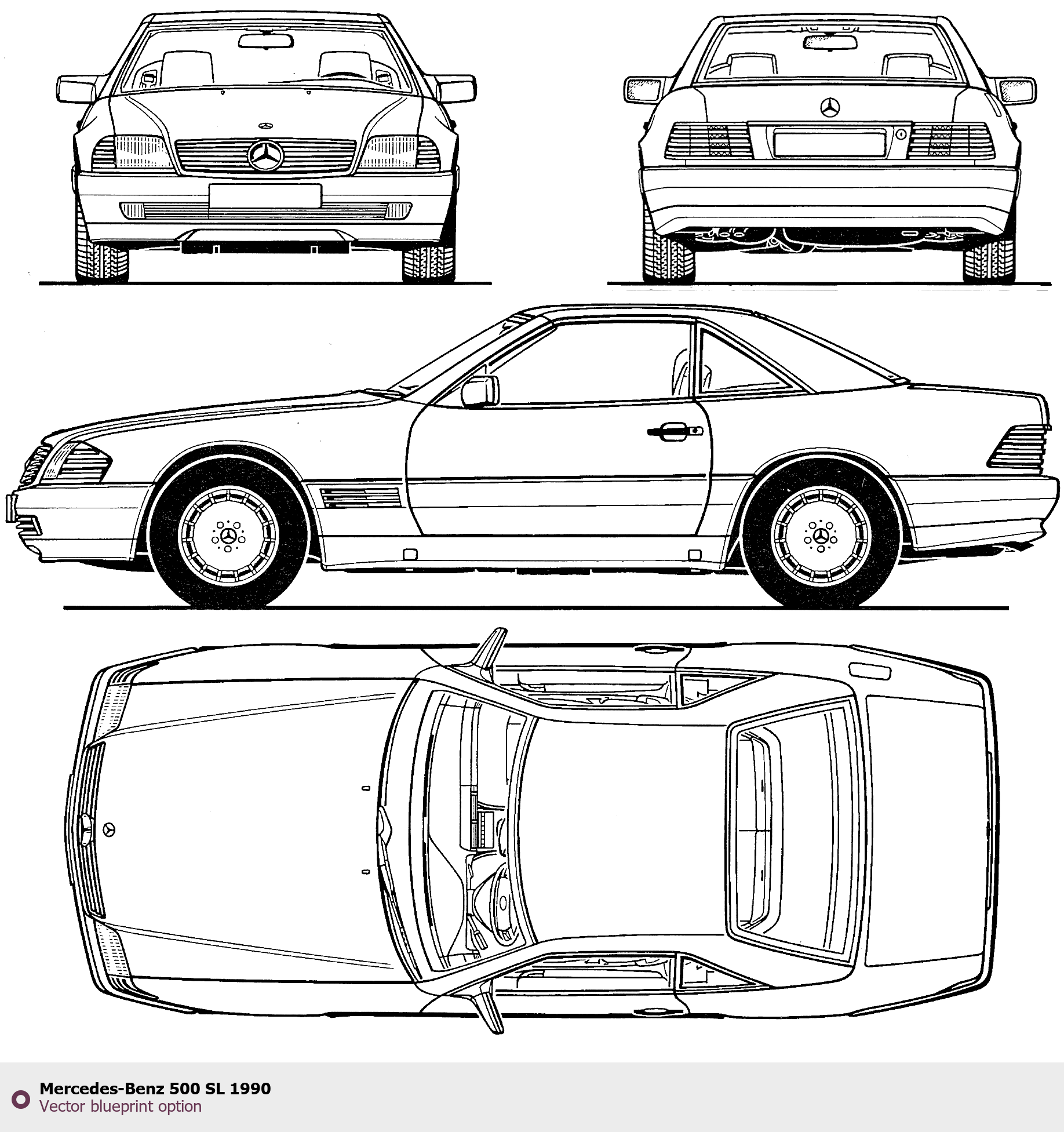 Raster blueprint of the 1990 Mercedes-Benz 500 SL Tag. This free downloadable image can be used for graphic projects, digital design, and 3D modeling. The file provides accurate exterior proportions of the vehicle. Model year: 1990. Body type: Tag.