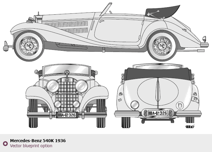 Raster blueprint of the 1936 Mercedes-Benz 540K Tag. This free downloadable image can be used for graphic projects, digital design, and 3D modeling. The file provides accurate exterior proportions of the vehicle. Model year: 1936. Body type: Tag.