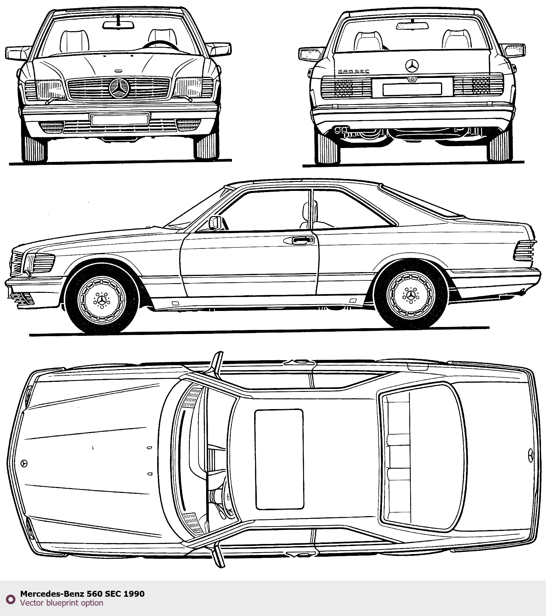 Raster blueprint of the 1990 Mercedes-Benz 560 SEC Tag. This free downloadable image can be used for graphic projects, digital design, and 3D modeling. The file provides accurate exterior proportions of the vehicle. Model year: 1990. Body type: Tag.