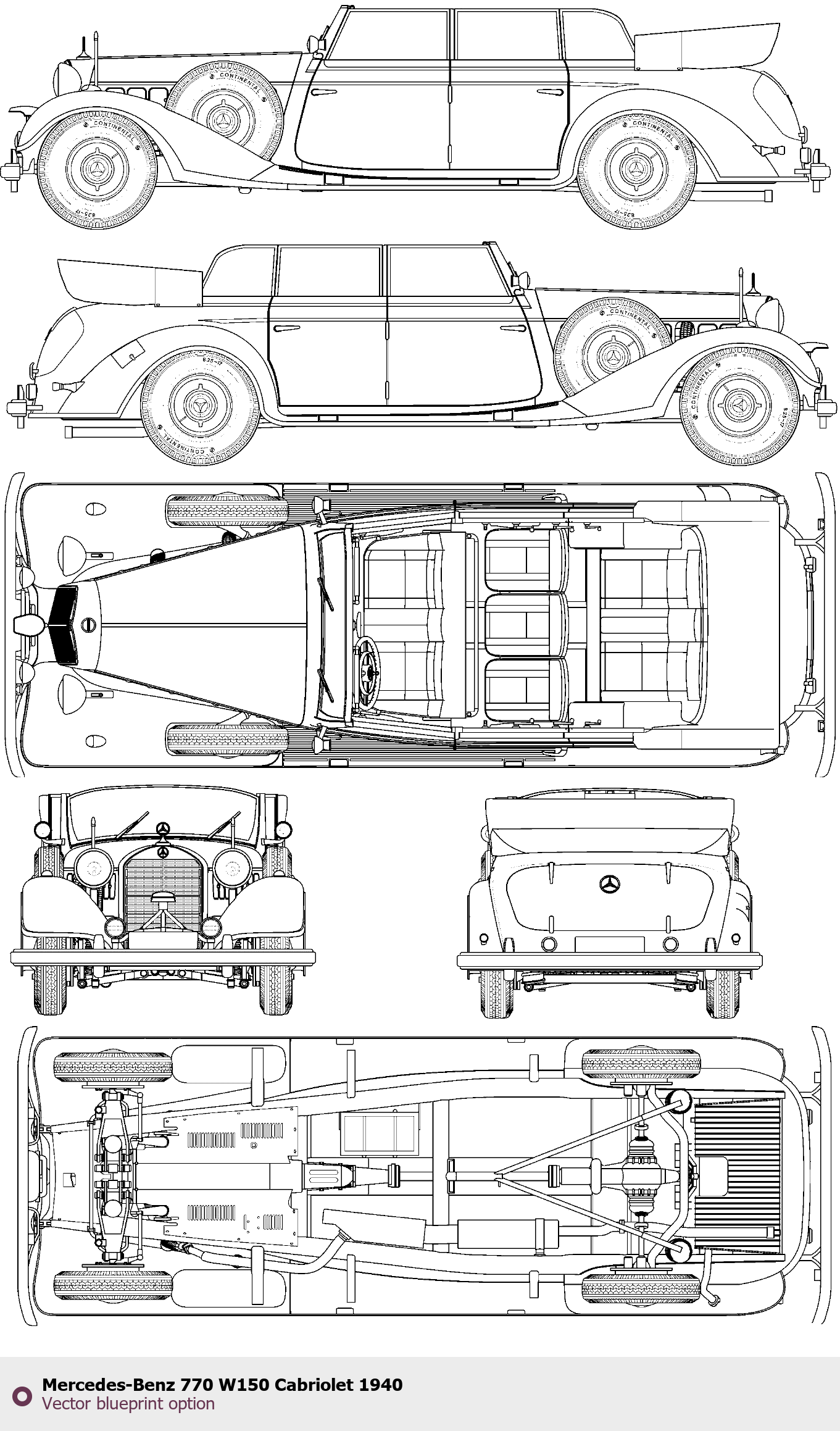 Raster blueprint of the 1940 Mercedes-Benz 770 W150 Cabriolet Cabriolet. This free downloadable image can be used for graphic projects, digital design, and 3D modeling. The file provides accurate exterior proportions of the vehicle. Model year: 1940. Body type: Cabriolet.