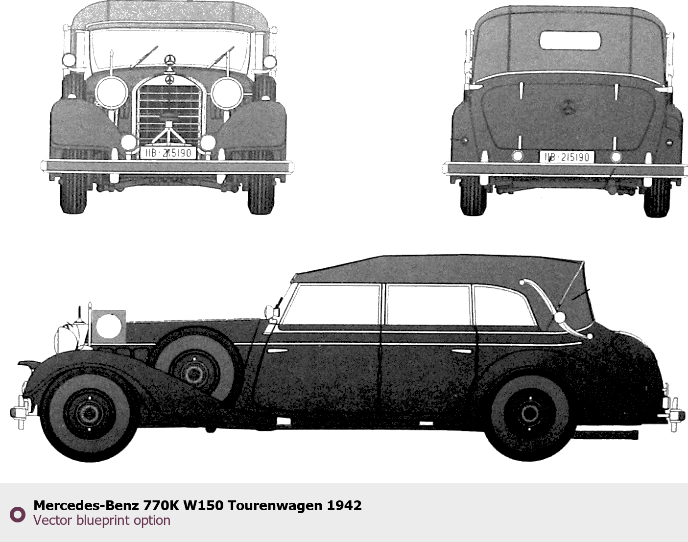 Raster blueprint of the 1942 Mercedes-Benz 770K W150 Tourenwagen Tag. This free downloadable image can be used for graphic projects, digital design, and 3D modeling. The file provides accurate exterior proportions of the vehicle. Model year: 1942. Body type: Tag.