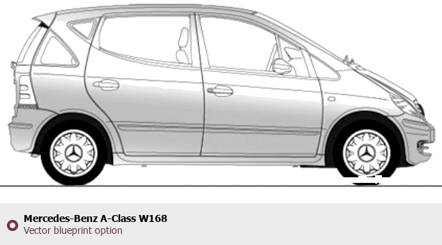 Raster blueprint of the Mercedes-Benz A-Class W168 Hatchback. This free downloadable image can be used for graphic projects, digital design, and 3D modeling. The file provides accurate exterior proportions of the vehicle. Body type: Hatchback.