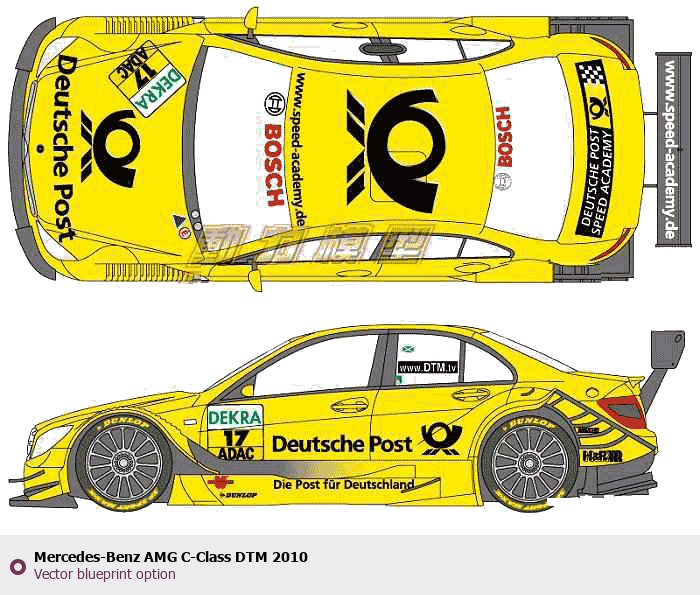 Raster blueprint of the 2010 Mercedes-Benz AMG C-Class DTM Tag. This free downloadable image can be used for graphic projects, digital design, and 3D modeling. The file provides accurate exterior proportions of the vehicle. Model year: 2010. Body type: Tag.
