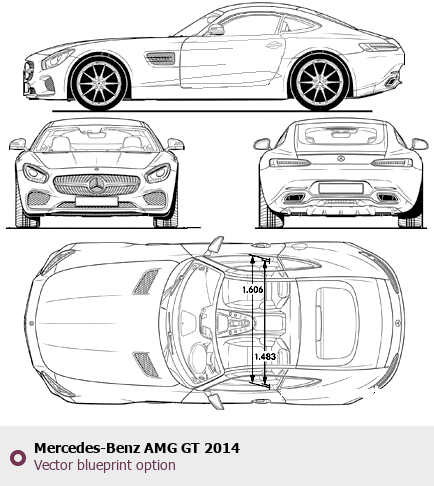 Raster blueprint of the 2014 Mercedes-Benz AMG GT Tag. This free downloadable image can be used for graphic projects, digital design, and 3D modeling. The file provides accurate exterior proportions of the vehicle. Model year: 2014. Body type: Tag.