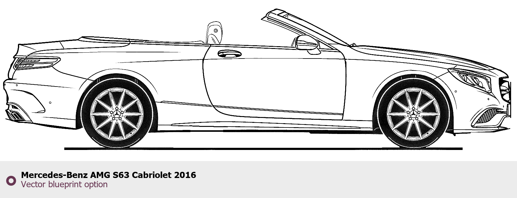 Raster blueprint of the 2016 Mercedes-Benz AMG S63 Cabriolet Cabriolet. This free downloadable image can be used for graphic projects, digital design, and 3D modeling. The file provides accurate exterior proportions of the vehicle. Model year: 2016. Body type: Cabriolet.