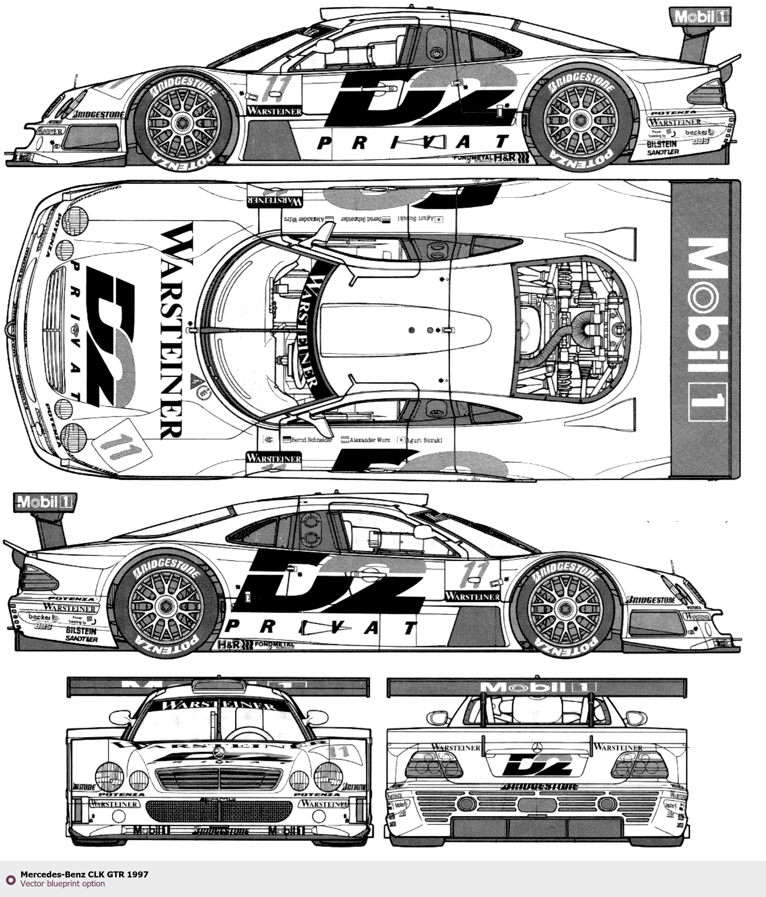 Raster blueprint of the 1997 Mercedes-Benz CLK GTR Tag. This free downloadable image can be used for graphic projects, digital design, and 3D modeling. The file provides accurate exterior proportions of the vehicle. Model year: 1997. Body type: Tag.