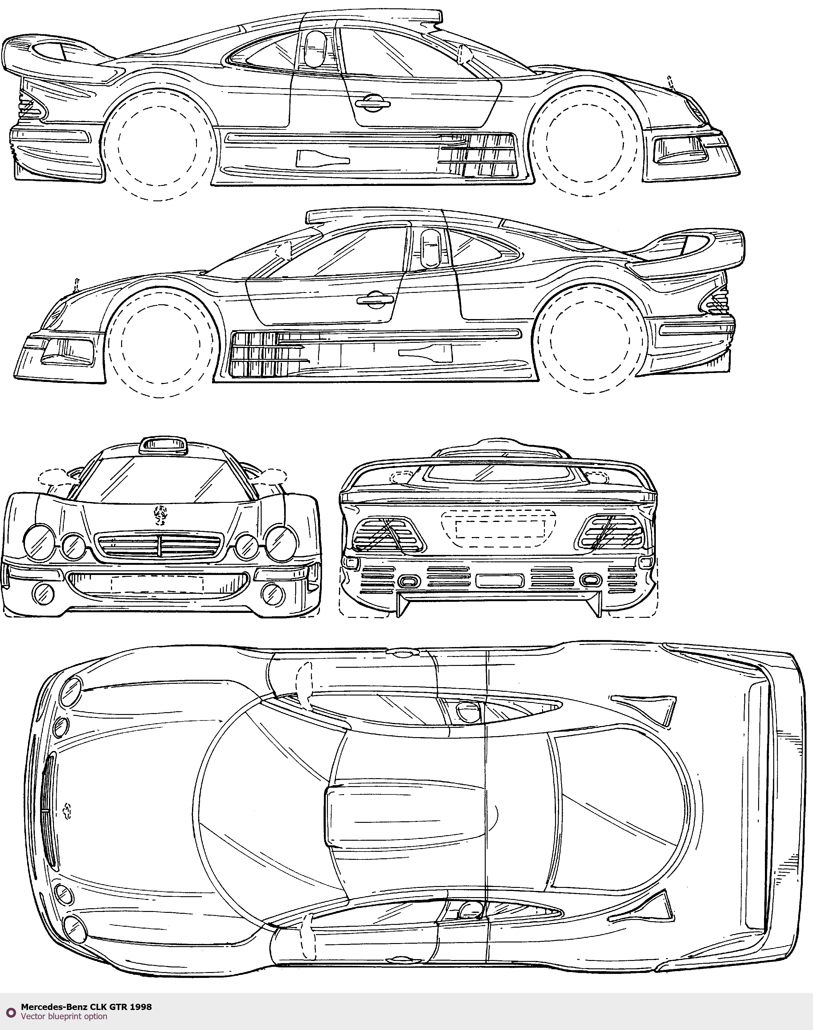 Raster blueprint of the 1998 Mercedes-Benz CLK GTR Tag. This free downloadable image can be used for graphic projects, digital design, and 3D modeling. The file provides accurate exterior proportions of the vehicle. Model year: 1998. Body type: Tag.