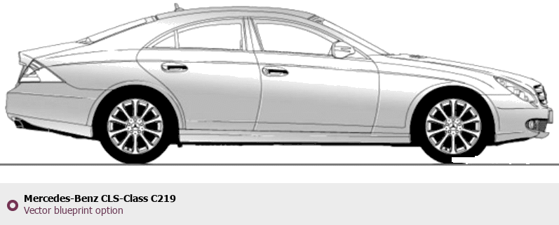 Raster blueprint of the Mercedes-Benz CLS-Class C219 Sedan. This free downloadable image can be used for graphic projects, digital design, and 3D modeling. The file provides accurate exterior proportions of the vehicle. Body type: Sedan.