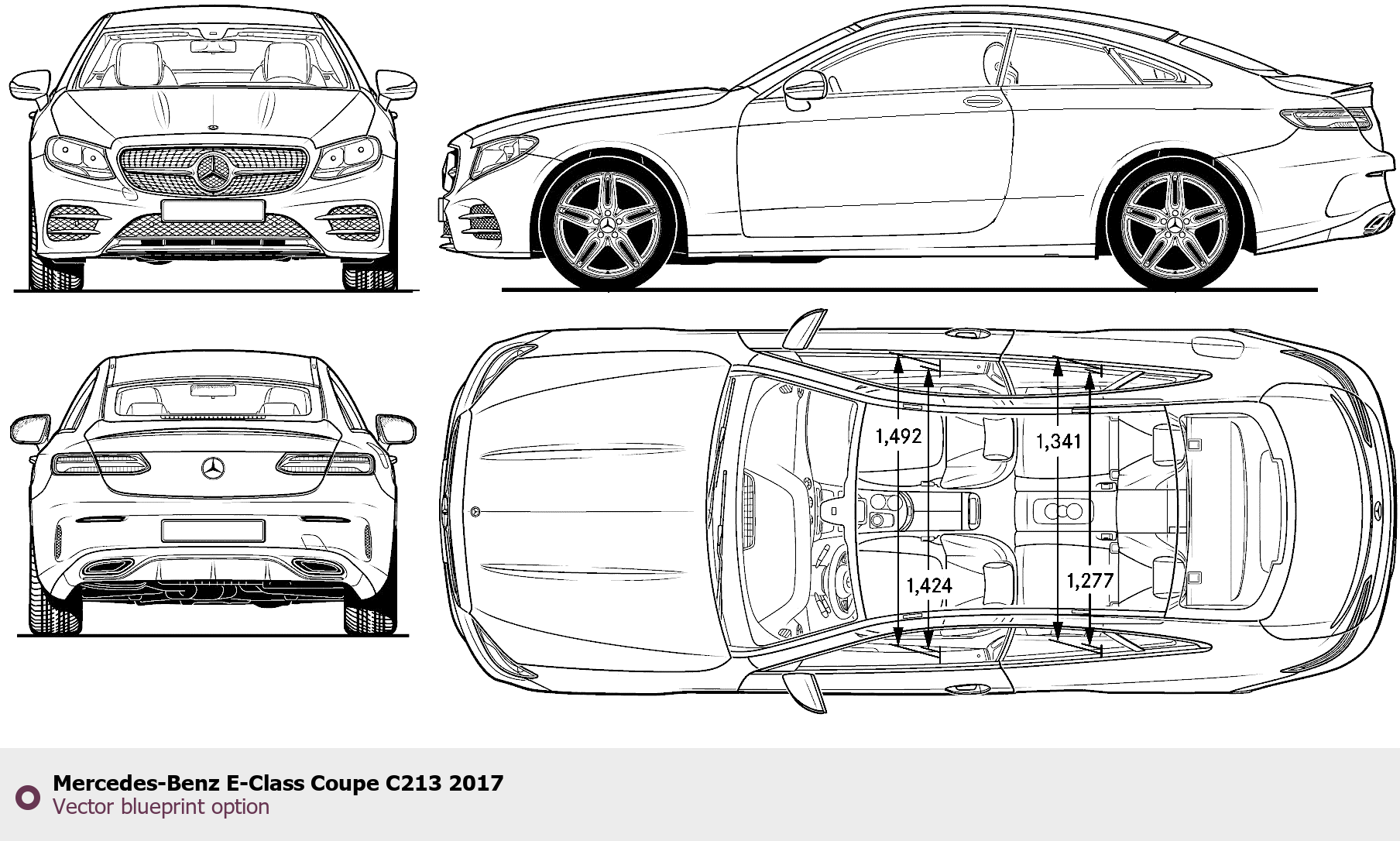 Raster blueprint of the 2017 Mercedes-Benz E-Class Coupe C213 Coupe. This free downloadable image can be used for graphic projects, digital design, and 3D modeling. The file provides accurate exterior proportions of the vehicle. Model year: 2017. Body type: Coupe.