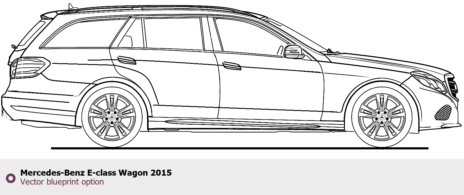 Raster blueprint of the 2015 Mercedes-Benz E-class Wagon Wagon. This free downloadable image can be used for graphic projects, digital design, and 3D modeling. The file provides accurate exterior proportions of the vehicle. Model year: 2015. Body type: Wagon.