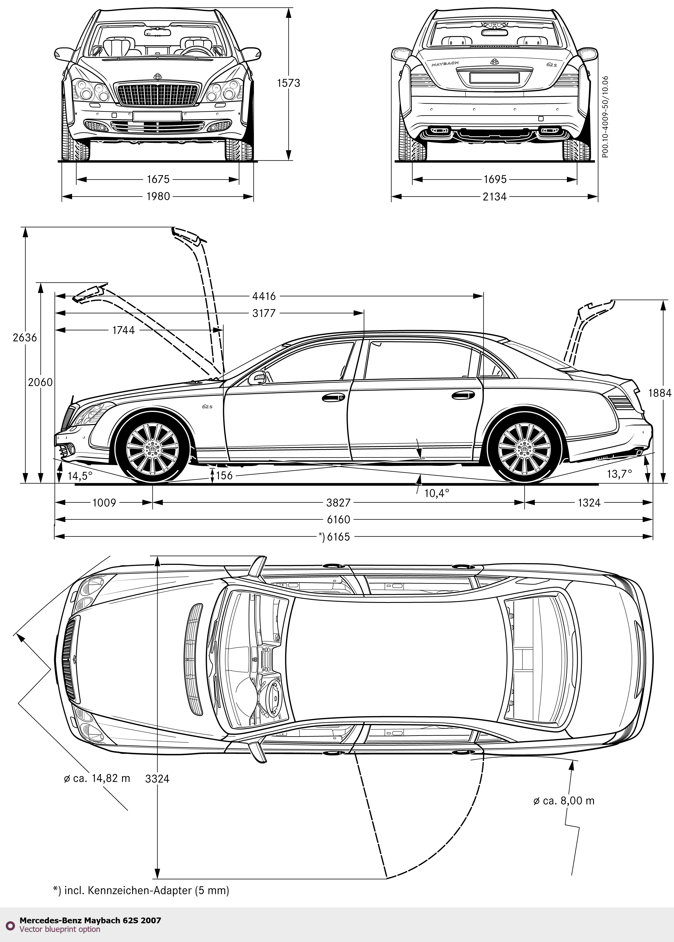 Raster blueprint of the 2007 Mercedes-Benz Maybach 62S Tag. This free downloadable image can be used for graphic projects, digital design, and 3D modeling. The file provides accurate exterior proportions of the vehicle. Model year: 2007. Body type: Tag.