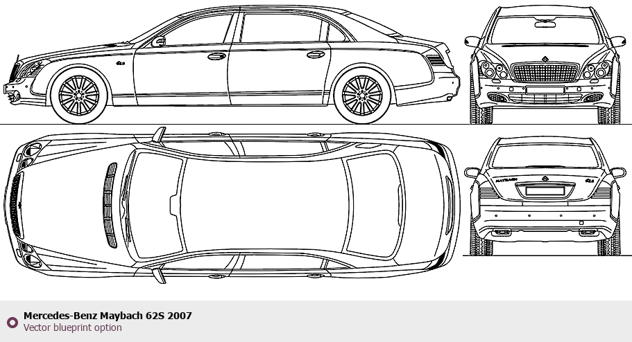 Raster blueprint of the 2007 Mercedes-Benz Maybach 62S Tag. This free downloadable image can be used for graphic projects, digital design, and 3D modeling. The file provides accurate exterior proportions of the vehicle. Model year: 2007. Body type: Tag.